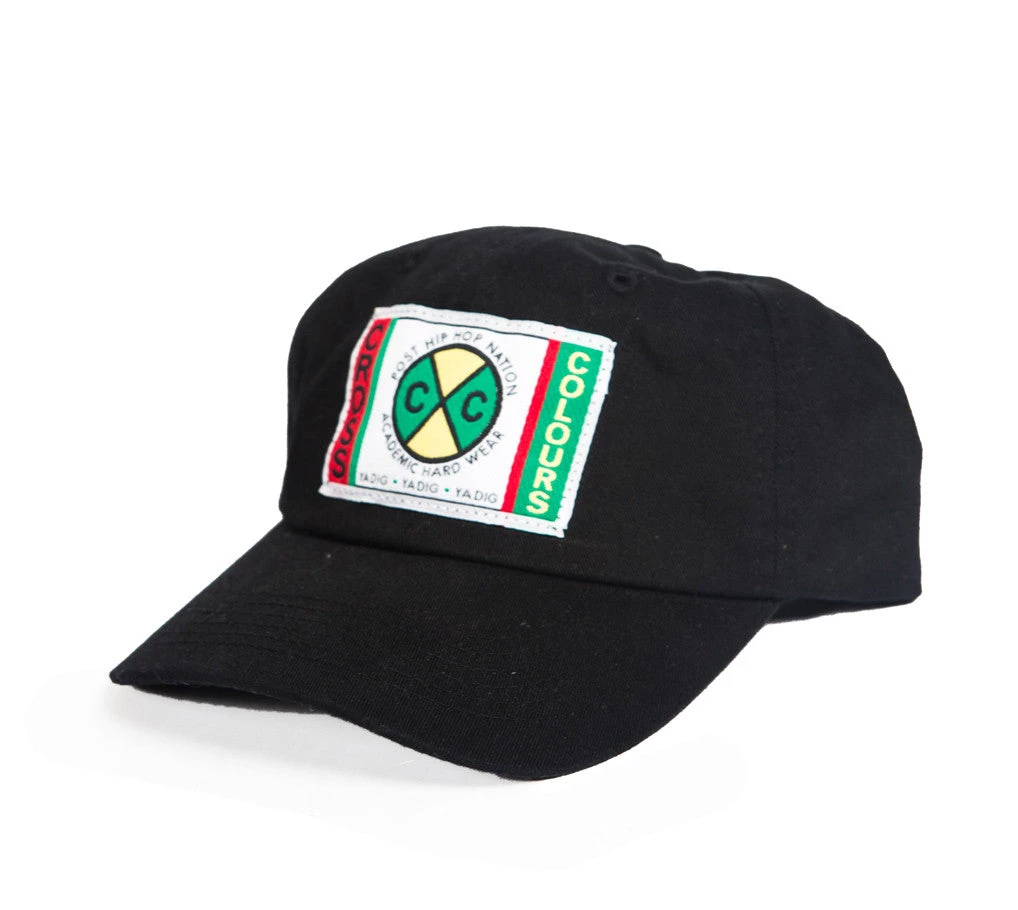Original Cross Colours Dad Hat with large woven label, Black. 85% Acrylic 15% Cotton. Made in China.