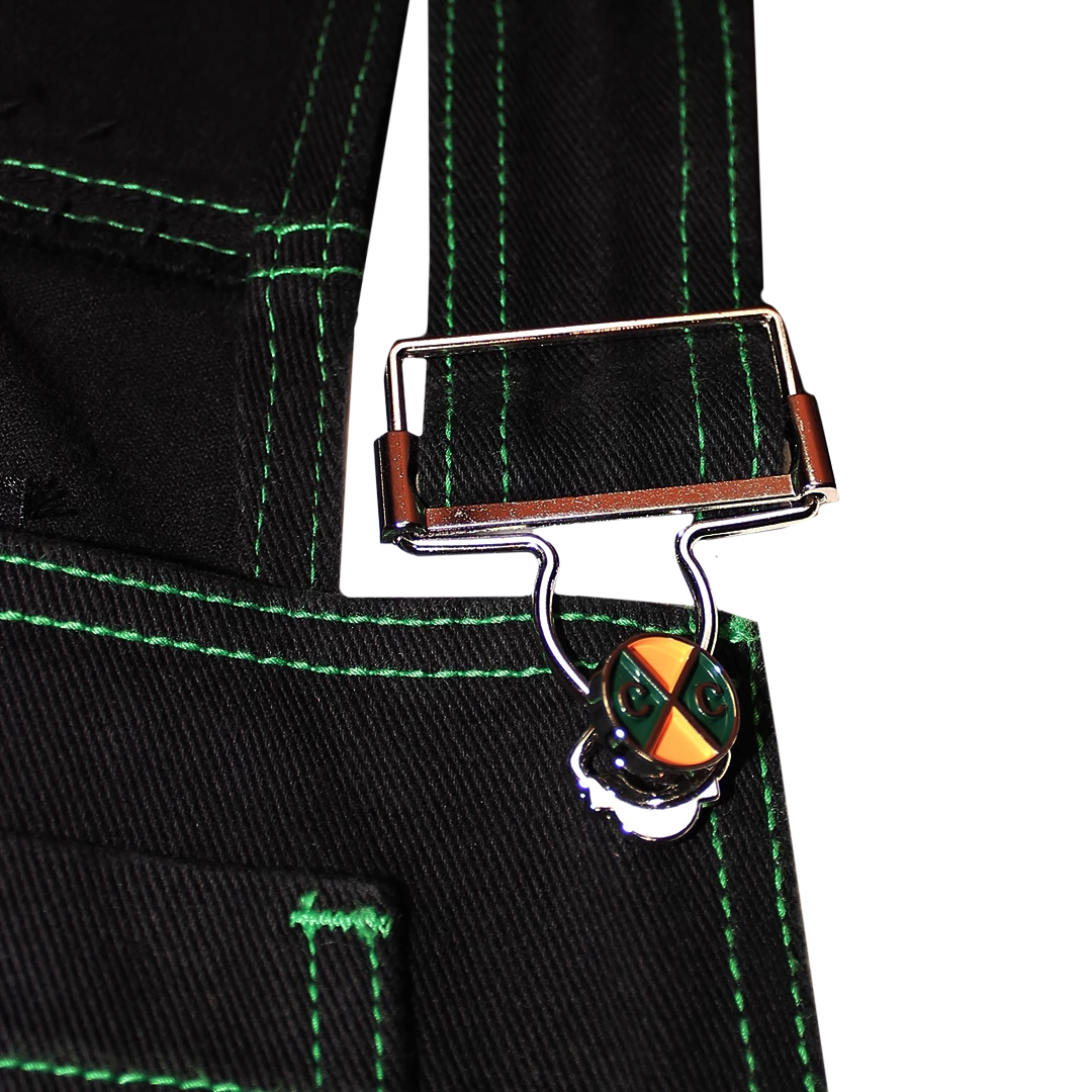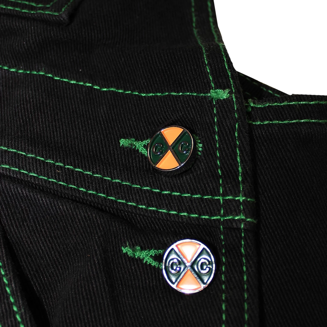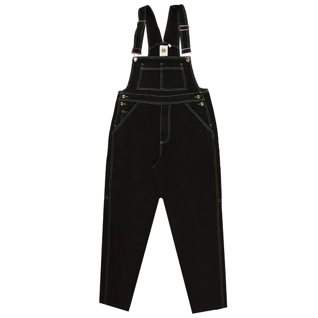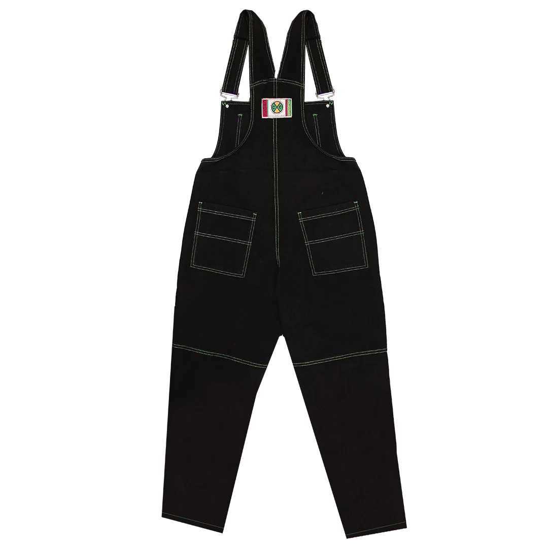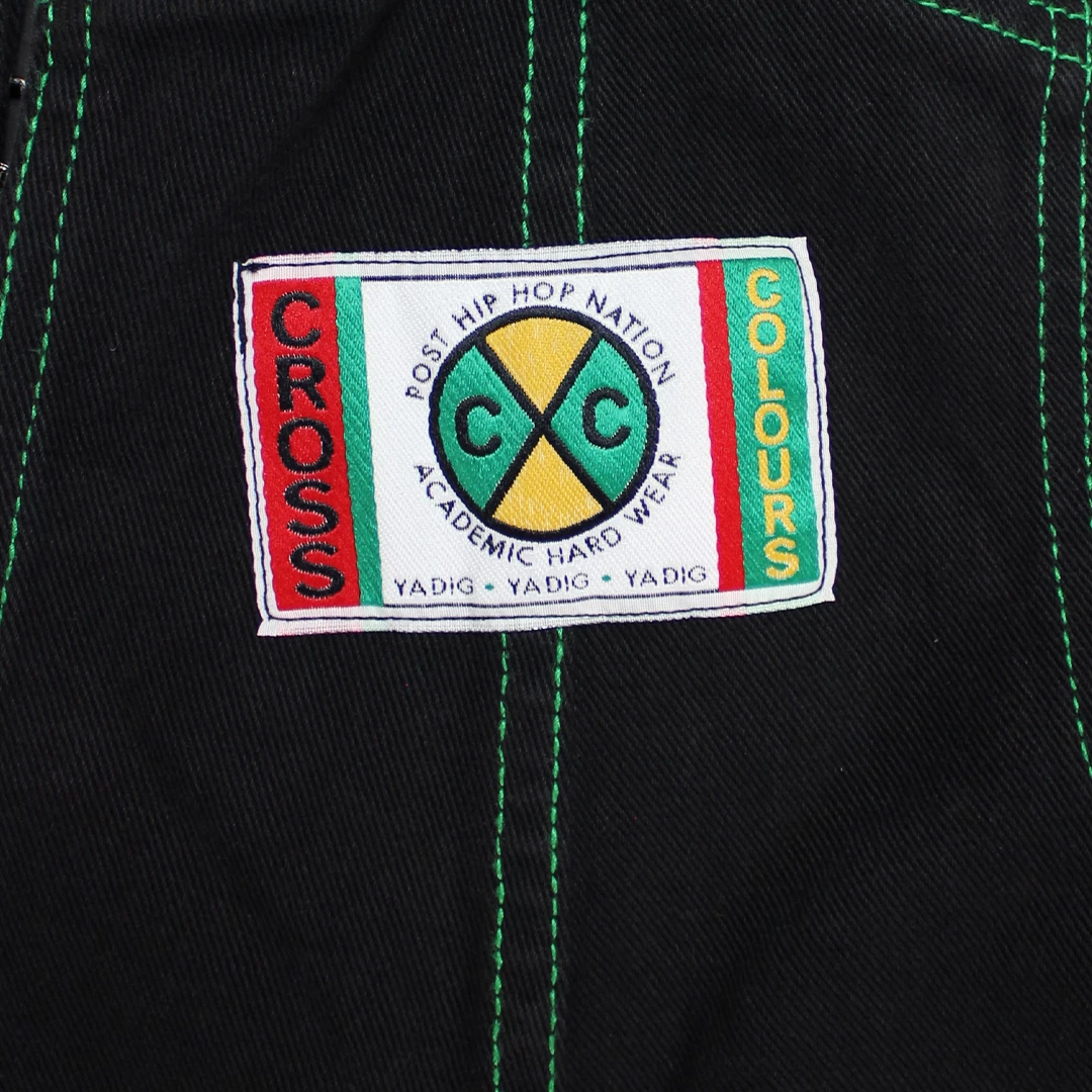 Original brushed twill overalls with green stitching; Cross Colours woven label sewn on the back pocket, original Cross Colours buttons.