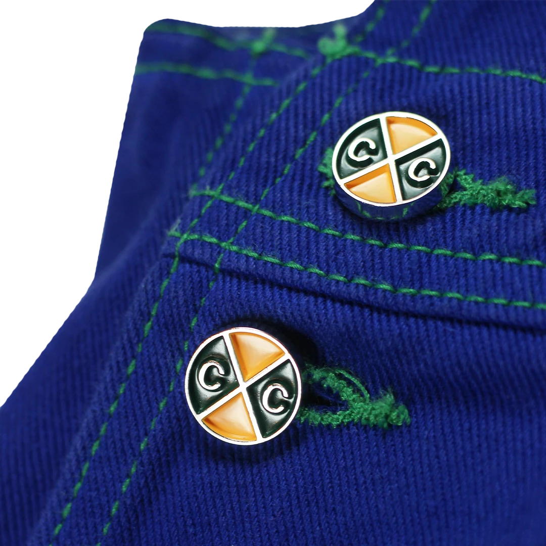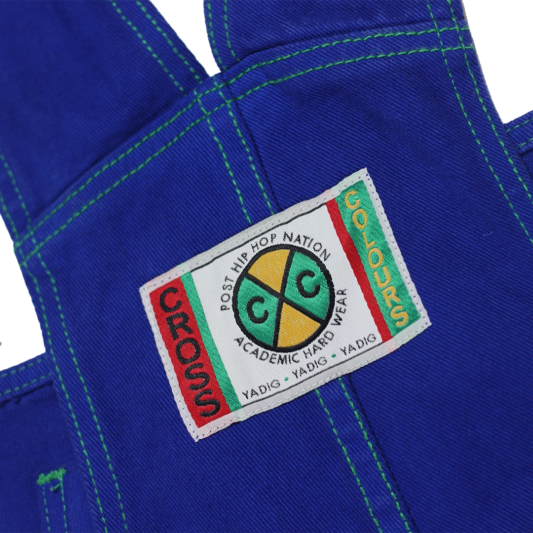 Original brushed twill overalls with green stitching; Cross Colours woven label sewn on the back pocket, original Cross Colours buttons.