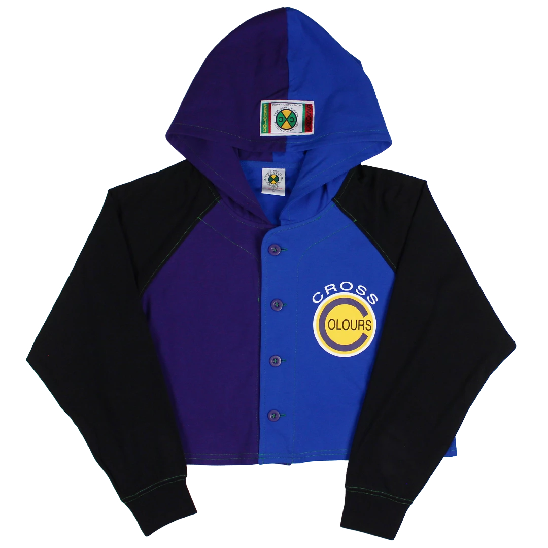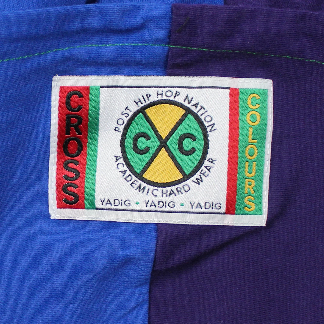 Retro color block baseball jacket with hood; original graphic print on the front; original Cross Colours woven label sewn on the hood.