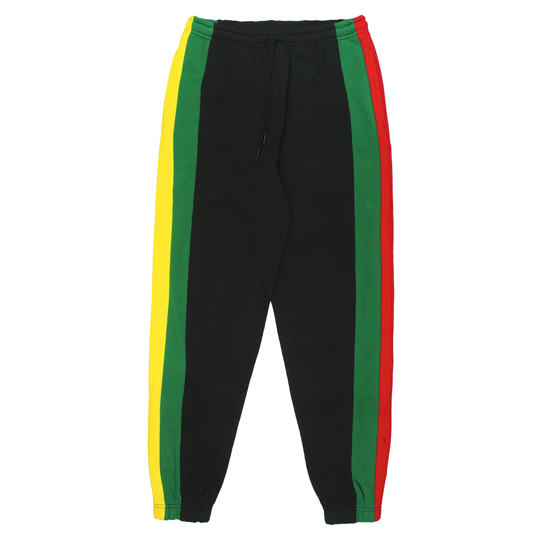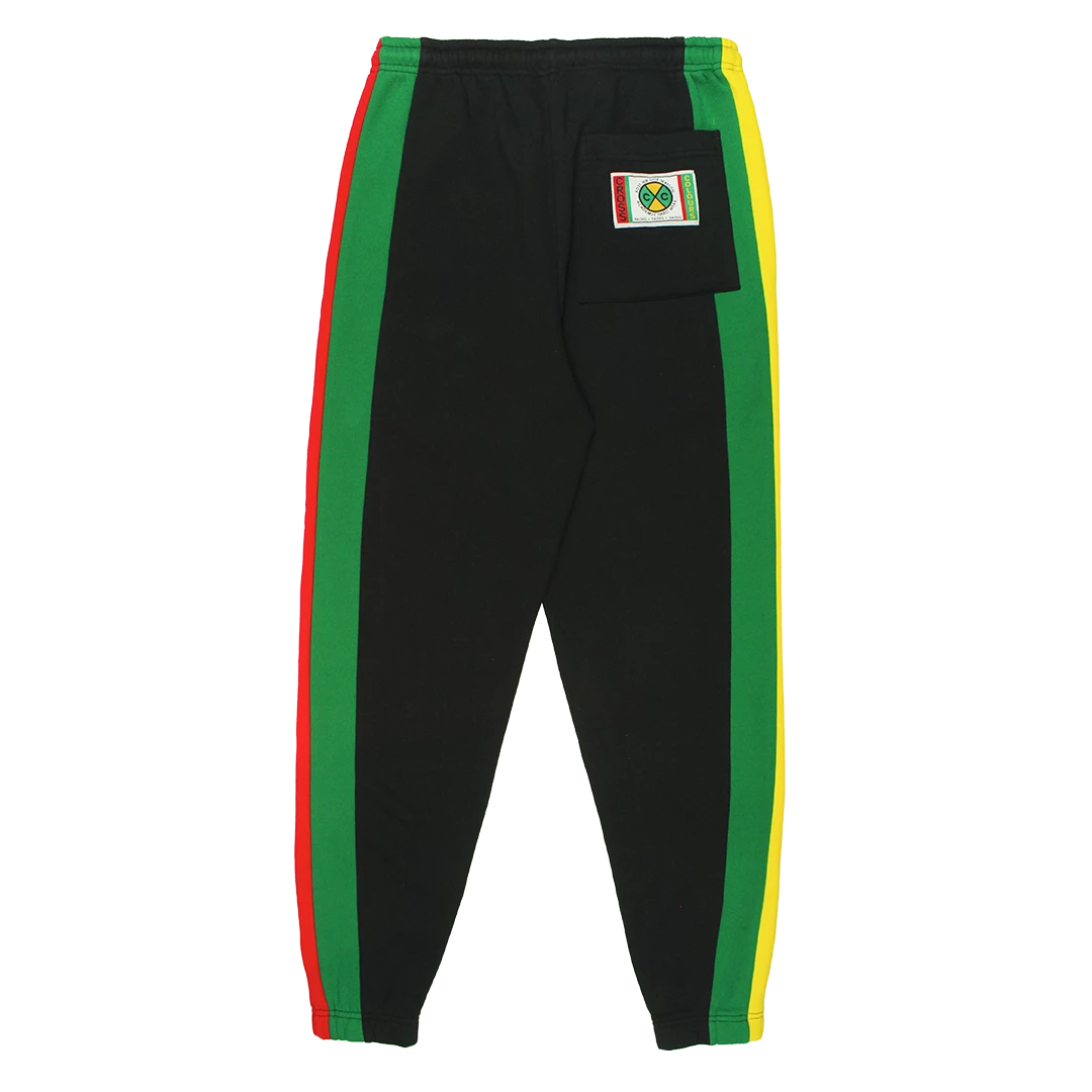 Classic sweatpants with color block stripe side panels; lined pockets, back pocket with zipper; original Cross Colours woven label sewn on back pocket.