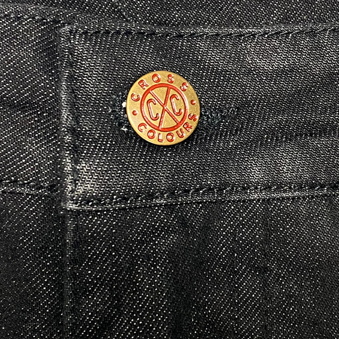 Original Cross Colours Relaxed Drop Crotch Patch Jeans; Cross Colours woven label on pocket, original Cross Colours buttons.