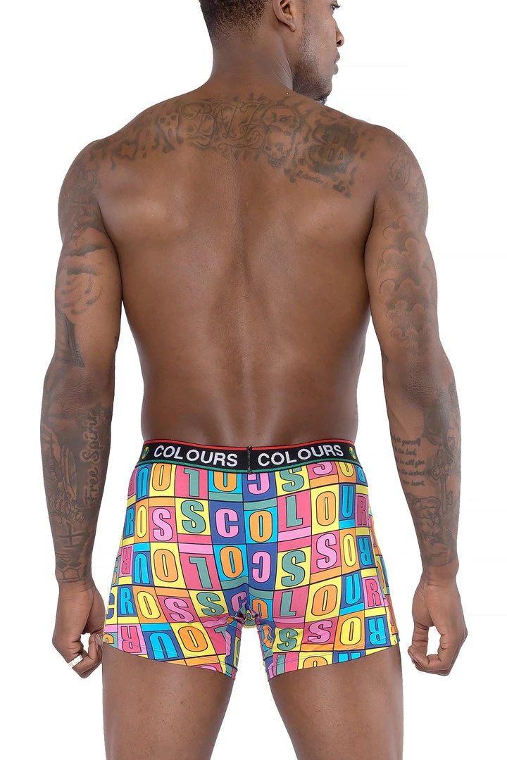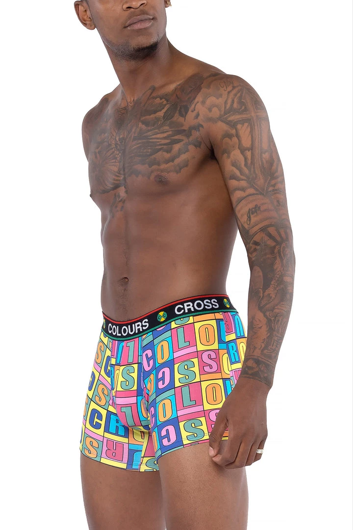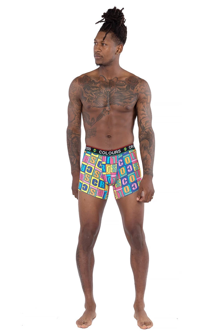 At the crossroads of form and fashion, the Cross Colours boxer brief is built for comfort. 95% cotton, 5% spandex, made in China. Multi colored letters and squares, with custom Cross Colours waistband.