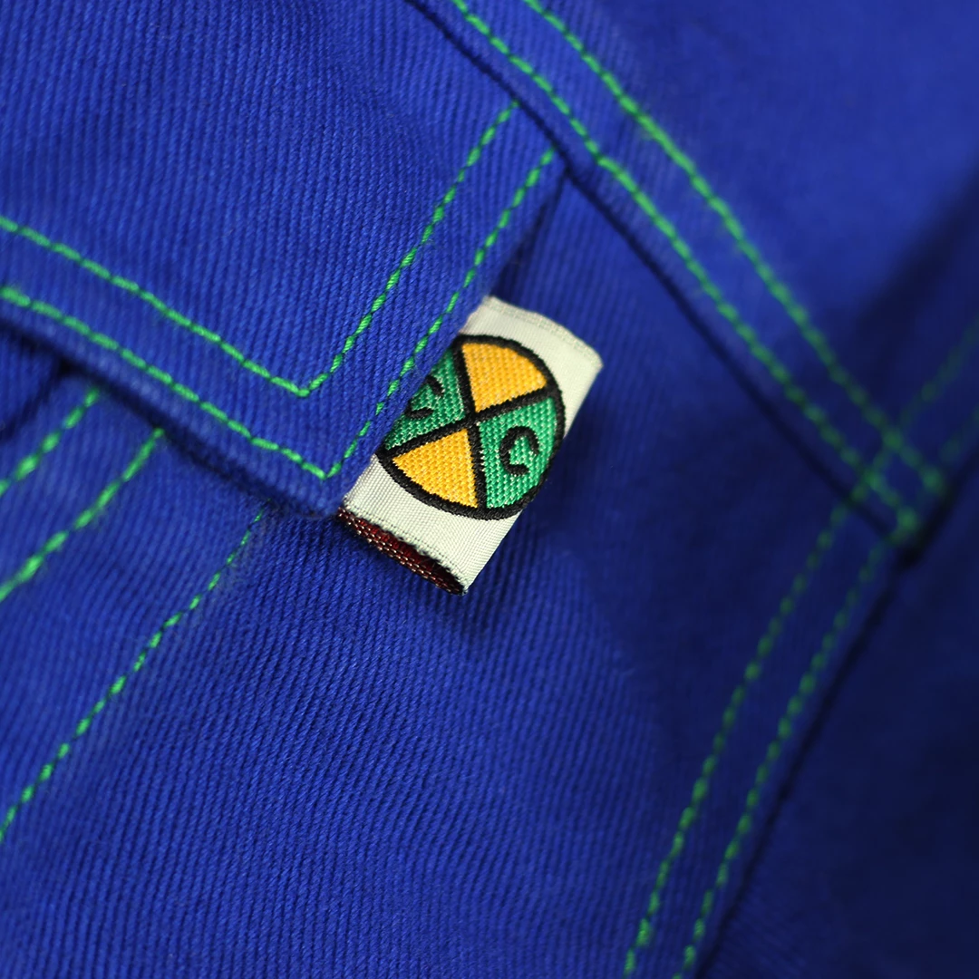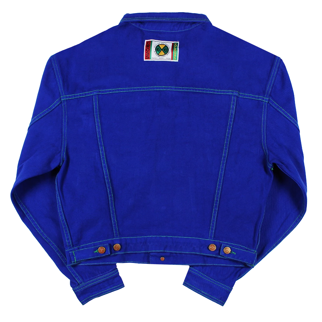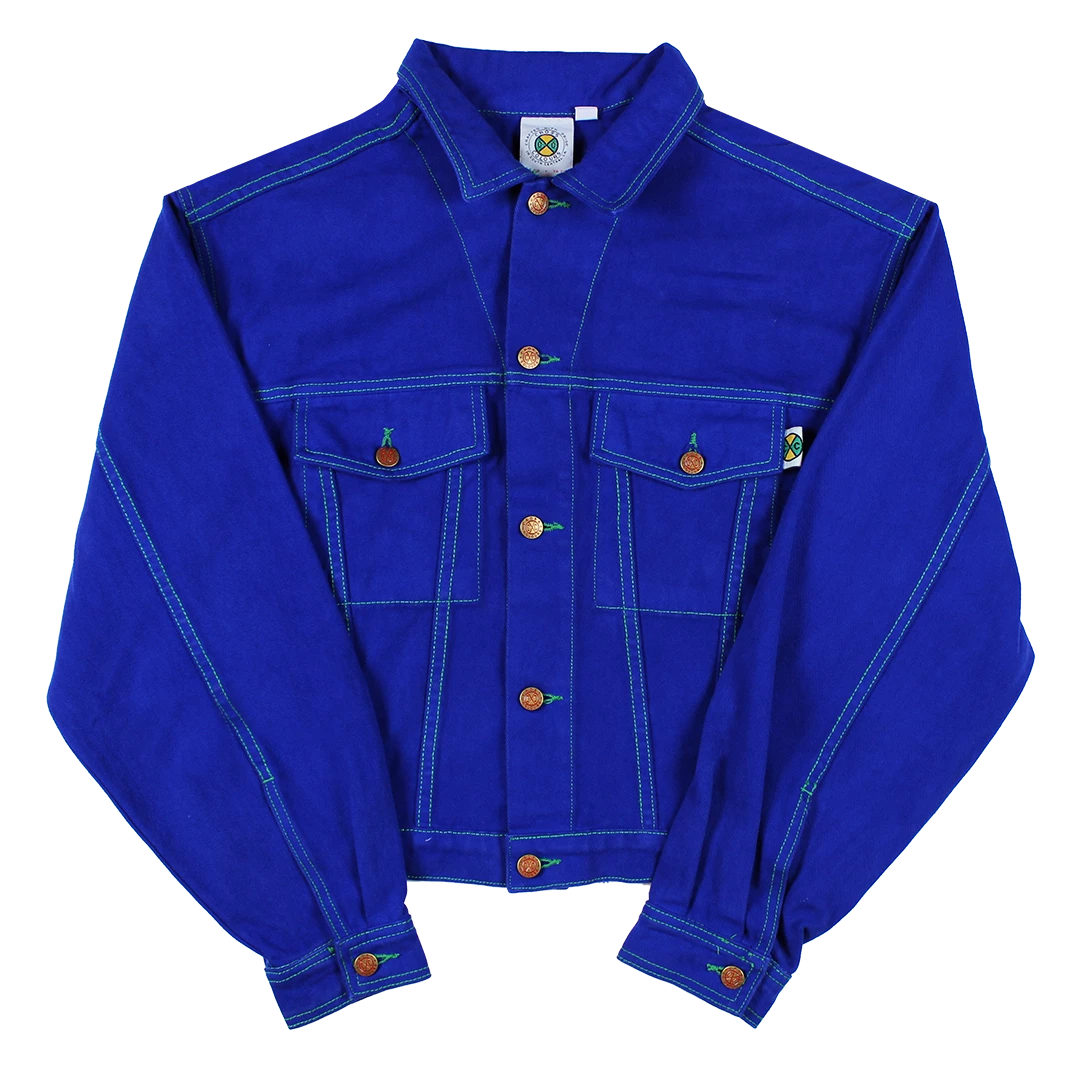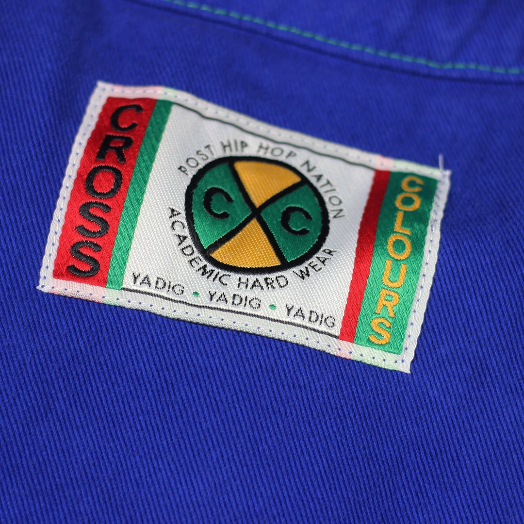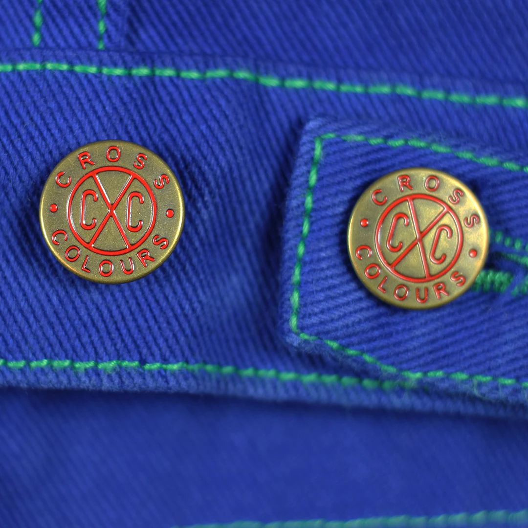 Original exaggerated shoulder twill jacket with signature buttons and green stitching; Cross Colours woven label sewn on the collar.